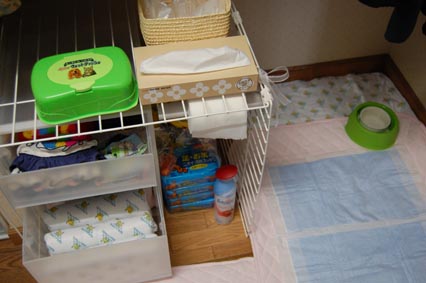 去年までは、こんな風にシェルターに入ってましたけど、最近は全然入らないので、思い切って模様替えしました。なんでも手が届く所にあると便利~。